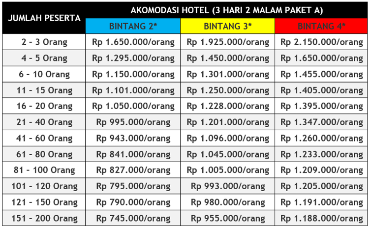 Harga untuk semua paket tour di atas adalah harga /orang dengan minimum peserta adalah 2 orang. Bayi umur kurang dari 3 tahun free, 3-5 tahun 50%, 6-7 tahun 75%, 8 tahun 100%
