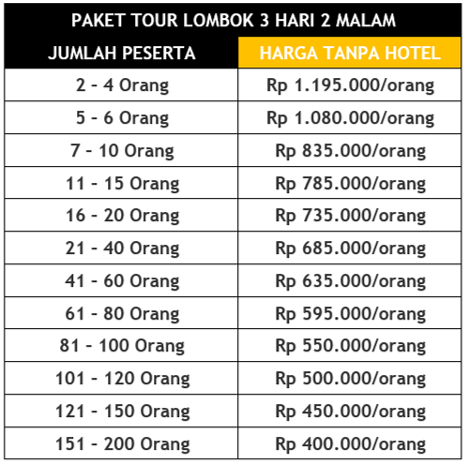 Berikut Ini Detail Harga Paket Tour Lombok 3 Hari 2 Malam Tanpa Hotel Sesuai Dengan Jumlah Peserta