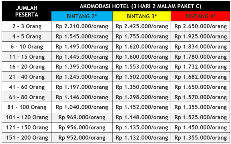 Harga untuk semua paket tour di atas adalah harga /orang dengan minimum peserta adalah 2 orang. Bayi umur kurang dari 3 tahun free, 3-5 tahun 50%, 6-7 tahun 75%, 8 tahun 100%